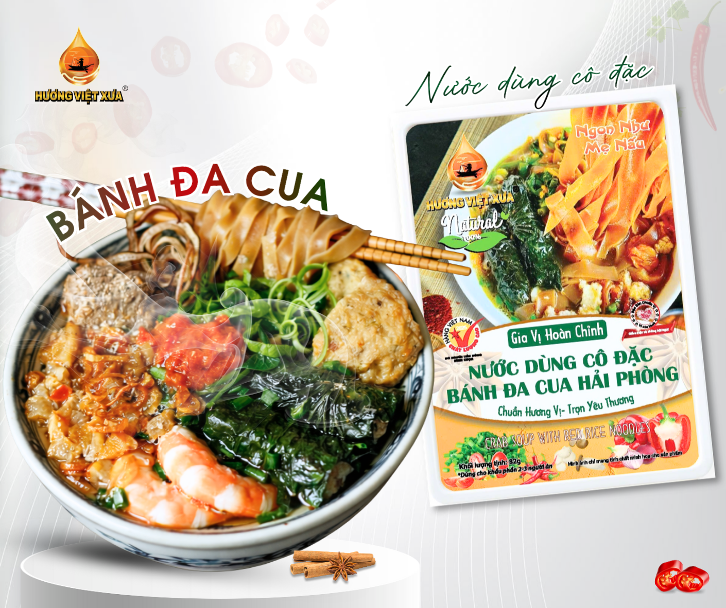 | Gia vị hoàn chỉnh Nước dùng cô đặc BÁNH ĐA CUA dùng làm nước dùng hoàn chỉnh cho món Bánh đa cua Hải Phòng Bước 1: Nấu nước sôi khoảng 1 lít nước sau đó cho thịt cua vào. Bộ dành cho người ăn 2-3. Bước 2: Cho gói nước dùng Bánh đa cua 82g vào và tiếp tục đun sôi. Bước 3: Cho bánh đa đỏ và thịt cua vào tô, chan nước dùng, thêm hành phi, tiêu, rau và những gia vị yêu thích. Dùng để nấu món Canh/ Súp cũng tuyệt Món ăn sẽ ngon hơn khi sử dụng cùng sate và nước mắm của Hương Việt Xưa |